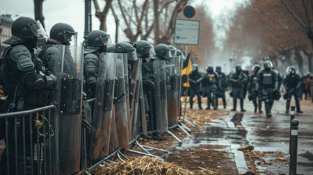 Riot police wearing protective gear and helmets are standing in formation, possibly during a demonstration, protest, or civil unrest, with a misty or smoky atmosphere in the background