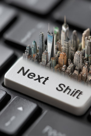 A miniature city model rests atop a keyboard key labeled Next Shift, suggesting technological progress. The image features a close-up perspective with varying building heights, textures, and colors. The composition focuses on a futuristic concept and is illuminated by ambient lighting. Suitable for commercial and illustrative applications.