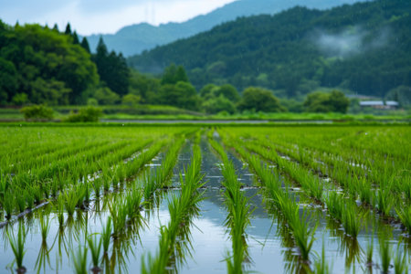 Lush green rice paddies with water reflections under cloudy skies in a mountainous region