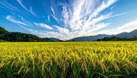 Cherry blossoms bloom vibrantly against a peaceful backdrop of rice paddies and mountains.