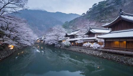 A picturesque Japanese village featuring snow-dusted traditional buildings and blooming cherry blossoms alongside a calm river with a bridge.