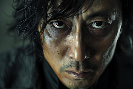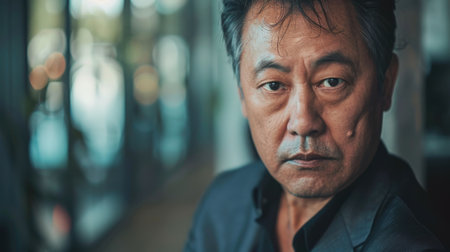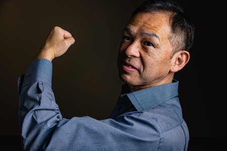 Middle-aged Japanese man in gray casual Y-shirt on dark background. Conceptual image of world peace, stability in daily life, and sustainable living.