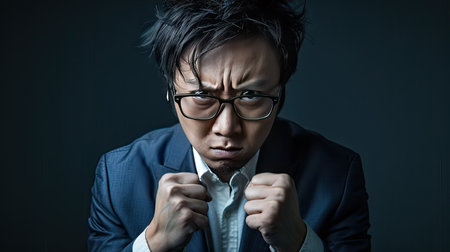 Young Asian man in a suit, wearing glasses, with an angry expression and clenched fists. Room for text on the left.