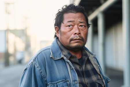 A man with short hair gazes into the camera, exuding confidence and poise. Urban setting. A resident of Kazakhstan, a cute man of 50 years old. A grown man, confident in his abilities. AI generated.