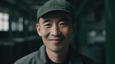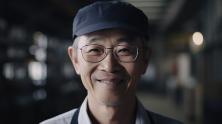 A smiling senior Chinese male factory worker standing in warehouse. Generative AI AIG19.