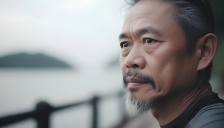 Mature Asian man standing on sunny balcony wearing green linen shirt over white tee gazing left. Casual, lifestyle, minimalist, outdoor, wellness, elegance, leisure