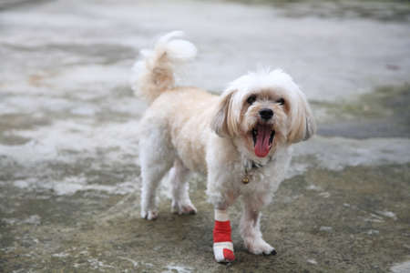 Smiling injured Shih Tzu leg wrapped by splint and red bandage after surgery due to leg accident. Portrait of injury dog at house. Animal insurance and healthy concept.