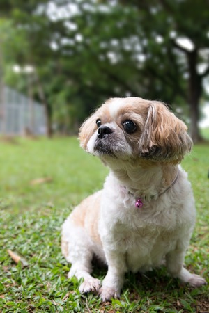 Shi tzu dog staying on the green grass. White dog looking for something on green grass in the park.