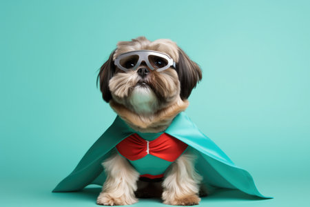 Shih Tzu Dog Dressed As A Superhero On Mint Color Background. Сoncept Shih Tzu Superhero, Mint Color Background, Canine Costumes, Dog Attire.