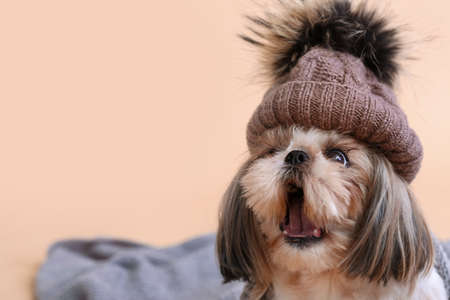 Cute dog in hat and with warm plaid on color background. Concept of heating season