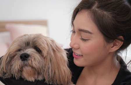 Young couple asian women spendong times at home to excerise and play with her dog.
