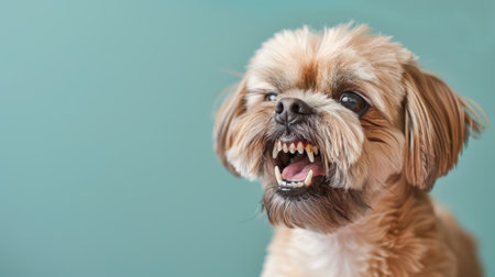 Shih Tzu, angry dog baring its teeth, studio lighting pastel background