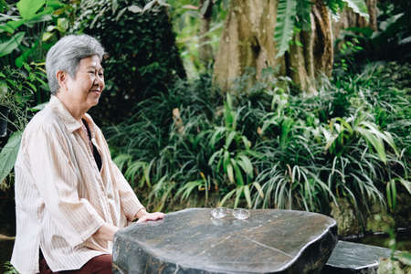 elder woman resting in garden. asian elderly female relaxing outdoors. senior leisure lifestyle