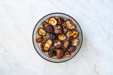 Dried Shiitake Mushroom on blue plate. Healthy food menu. Vegetarian food