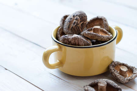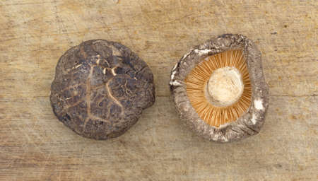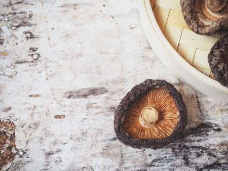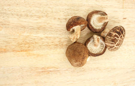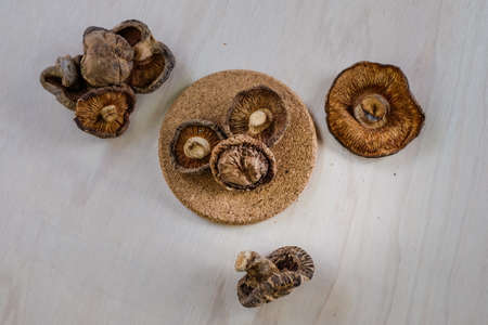 Dried shiitake mushroom on wooden background. Healthy food.