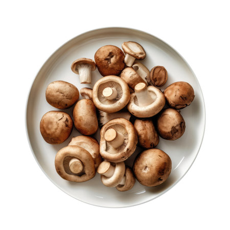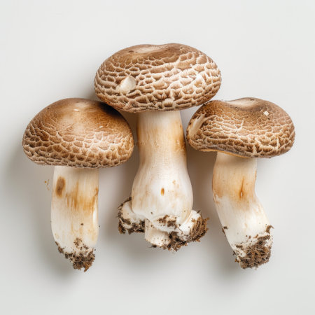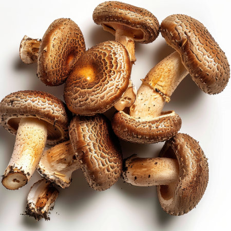 Discover a captivating arrangement of fresh brown mushrooms on a clean white background, showcasing their earthy texture and natural beauty for food-related projects.