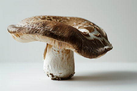 A minimalistic photo of a mushroom cut in half to reveal its interior, set against a plain white background for a clean and straightforward look.