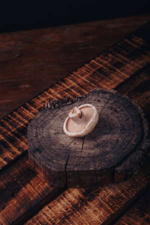Cut agaric tricholoma mushroom on tree cut stand, wooden background. Fresh raw forest mushrooms, seasonal hunting, vertical shot