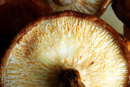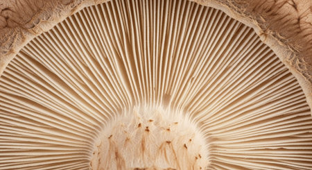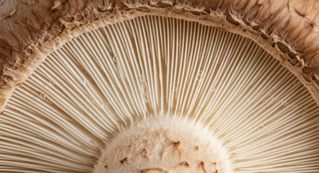 Macro shot showing the gills beneath a matsutake mushroom cap, revealing fine natural structure and light texture details