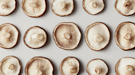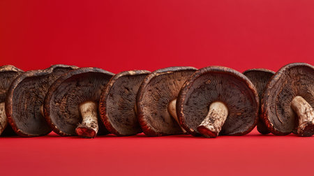 A stunning display of freshly sliced shiitake mushrooms set against a bold red background, perfect for highlighting culinary art and healthy eating.