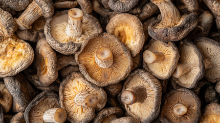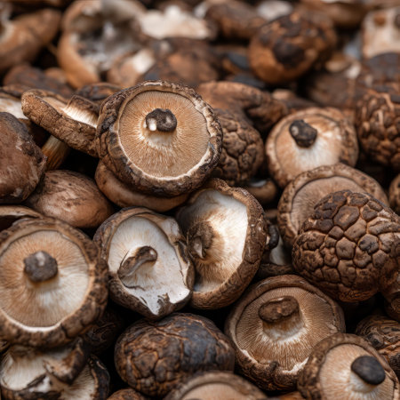 A detailed shot of a pile of dried shiitake mushrooms, showing the wrinkled texture of their caps, ready to be rehydrated for a flavorful broth.