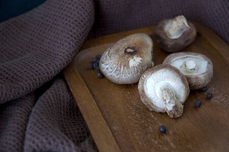 uncooked shitake mushroom on wooden tray