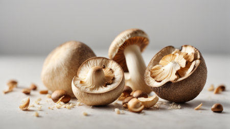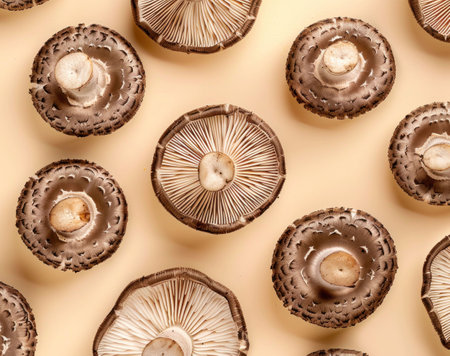 Mushrooms on a light yellow background, showcasing their textured caps and gills in a top down view, ideal for culinary and natural food imagery