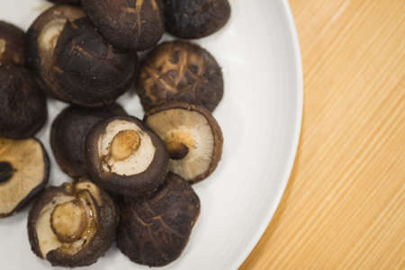 Shiitake mushrooms (Lentinus edodes) in white plate on the wooden background.