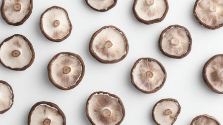 This image showcases freshly sliced mushrooms beautifully arranged on a white background, perfect for culinary projects, food blogs, or cooking classes.