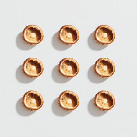 A collection of dried shiitake mushrooms arranged on a white background, showcasing their unique textures and shapes, perfect for culinary uses and food styling.
