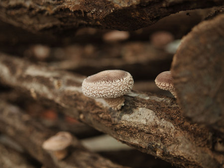 Tokyo, Japan - March 18, 2022: Closeup of log-grown or bed log cultivation shiitake mushroom