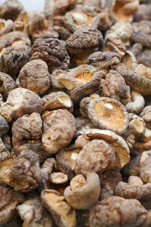 Dried shriveled edible shiitake mushrooms close up