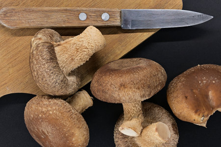 Fresh shiitake mushrooms and wooden cutting board with knife on it arranged on black background