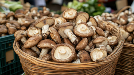 A basket filled with freshly harvested shiitake mushrooms at a farmers market, showcasing their rich, textured caps and inviting freshness.
