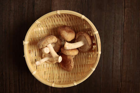 Fresh mushrooms on basket and wooden table background / Shiitake mushrooms