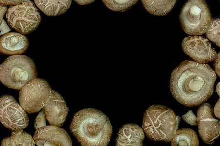 Pile of fresh shiitake mushrooms on black stone slate with copy space. Raw shitake, healthy organic asian fungi top view