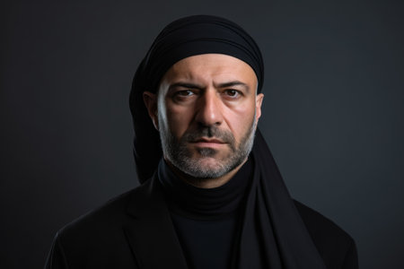 Portrait of a muslim man in a black hijab on a dark background
