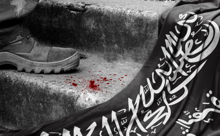 The leg of the military stands on the step next to the flag of Al Nusra Front, the concept of military conflict