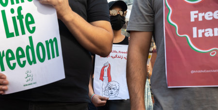 PORTLAND, OREGON, USA - Oct 15, 2022: People participate in a demonstration in solidarity with Iranian women and in memory of Mahsa Amini killed by the Iranian police.