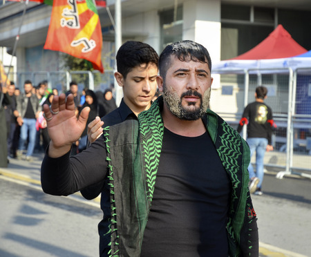 Istanbul, Turkey - October 11, 2016: Shia Muslim men shout Islamic slogans as they mourn during an Ashura procession. A man, mood chronology to adapt to his hair and clothes muddy. Caferis take part in a mourning procession marking the day of Ashura in Is