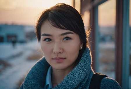 A young woman 25 years old urban setting, with warm, glowing light in the background highlighting her features as the sun sets. Fashionable serious brunette. A resident of Kazakhstan. AI generated
