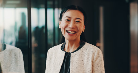 Smile, pride and portrait of businesswoman in office for finance career with growth. Confident, happy and mature Japanese female financial executive with positive attitude for company expenses.