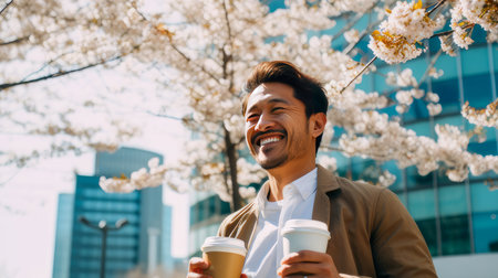 Modern happy young smiling Asian man with a mug of coffee against the background of pink cherry blossoms and metropolis city. Businessman, spring blossoms, happiness joy dreaming love, Mental health, psychological treatment concept, positive thinking, good thoughts