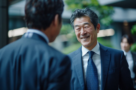 A Japanese businessman talks business with his colleague in a modern office environment, demonstrating professionalism and focus in their interactions.