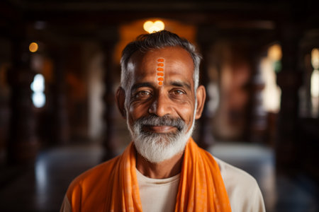 Portrait of an Indian man with orange scarf in the temple.