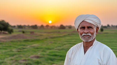 An elderly Indian farmer wearing a turban and traditional clothing stands in a field at sunset.