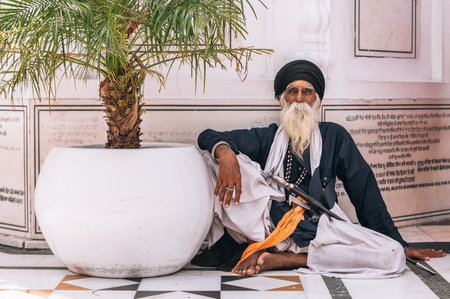 Amritsar, India - AUGUST 15: Portrait of an Old Sikh sitting at Golden Temple (Harmandir Sahib) on August 15, 2016 in Amritsar, Panjab, India.