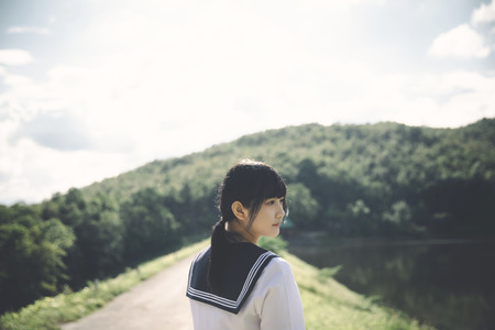 Portrait of asian japanese school girl costume looking at park outdoor film vintage style