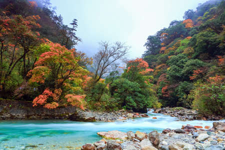 Beautiful river in forest nature. Peaceful autumn nature background.in Okutama japan. slow motion