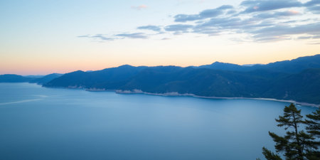 Beautiful sunset over the sea and mountains. Beautiful natural landscape.